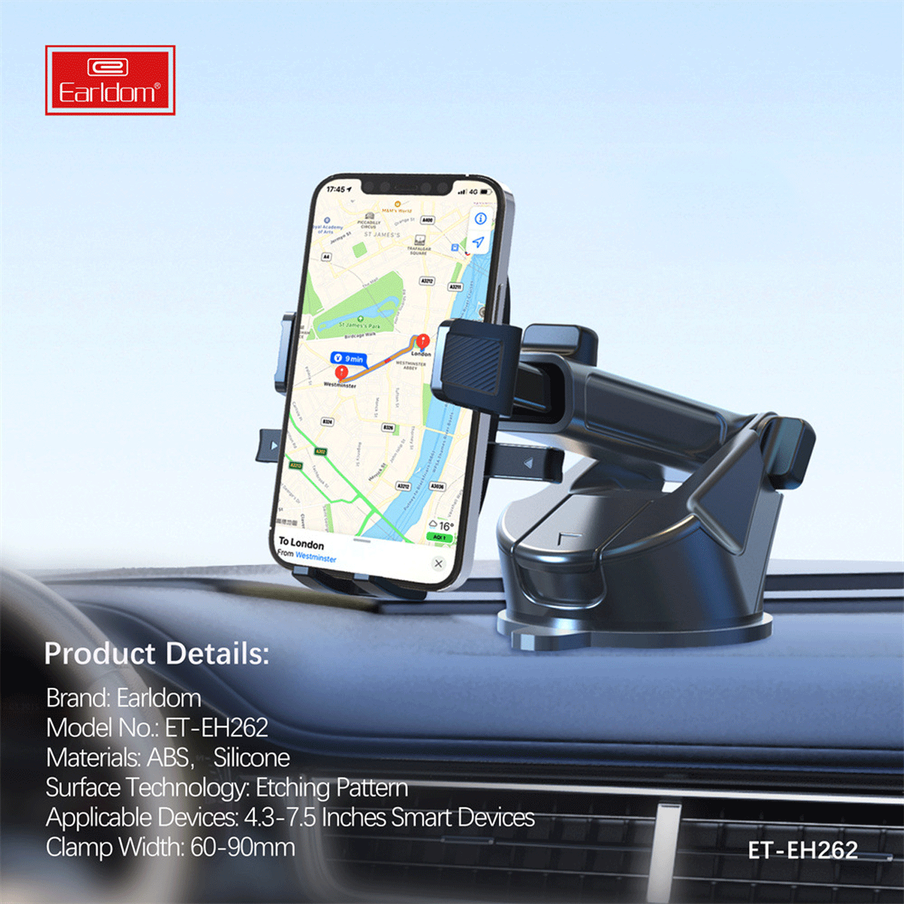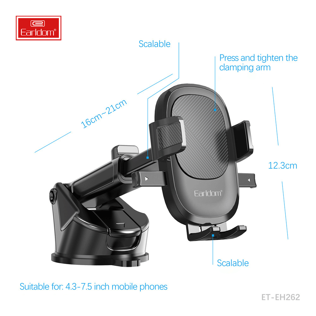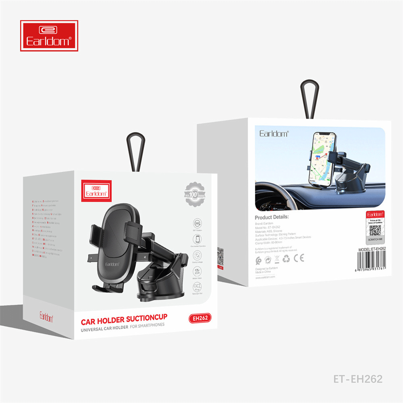 هولدر موبایل Earldom EH262 با طراحی بازویی، قفل محکم و چرخش 360 درجه، انتخابی ایده‌آل برای نصب گوشی روی داشبورد یا شیشه خودرو است.